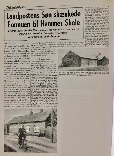 Ved sin død som 89-årig efterlod han sig en formue på en lille million. Da det første brev om arven dukkede op hos Hammer-Linnerup Sogneråd i 1962, var overraskelsen stor. Dels var der tale om et usædvanligt stort beløb - det svarede til over det tredobbelte af kommunens årsbudget. Dels var der ikke umiddelbart nogen, der var klar over hvem den store velgører var. Først efter nogen tid fandt man via kirkebøgerne frem til den unge mand, der var vokset op under jævne kår i Hammer. Man fandt ligeledes frem til et par lokale beboere, der kunne huske historien om landpostens søn.